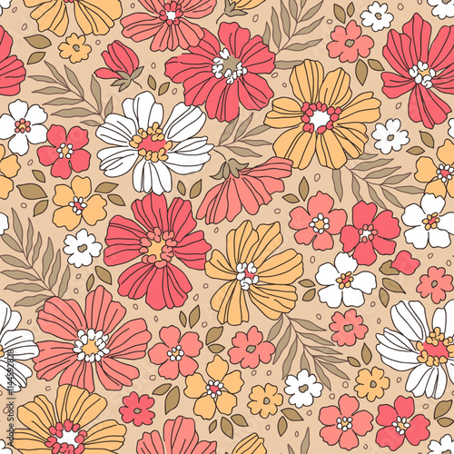 Vintage floral background. Floral pattern with small red and yellow flowers on a ivory beige background. Seamless pattern for design and fashion prints. Ditsy style. Stock vector pattern with daisy.