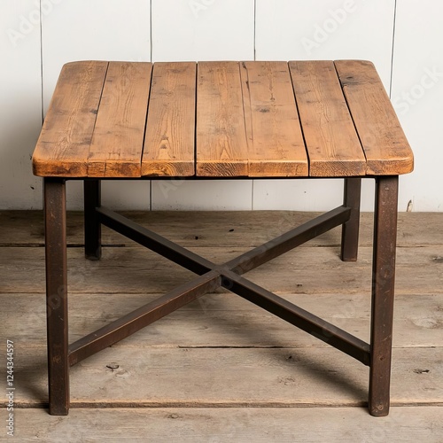 Vintage French bistro coffee table, weathered wooden top, metal frame, garden cafe scene