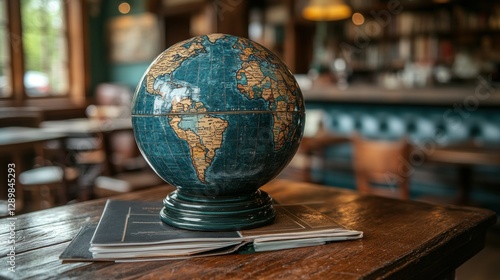 Vintage Globe on Wooden Table in a Rustic Pub Setting