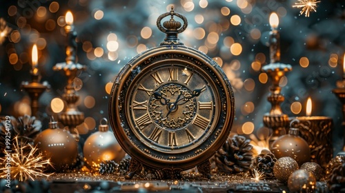Vintage Gold Clock Points to New Year with Fireworks on Beige Bokeh Background - Creative Celebration and Party Card Idea for Christmas and New Year