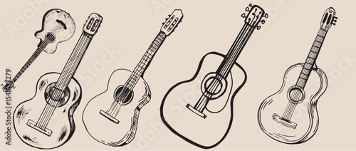 Vintage hand-drawn acoustic guitar illustration set in sketch style. A collection of different classical and folk guitar shapes.