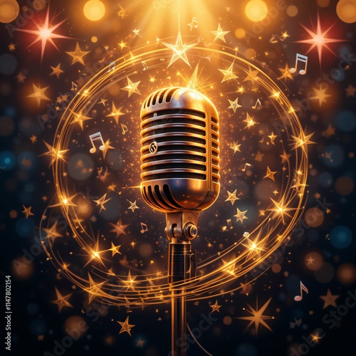 Vintage Microphone Surrounded by Musical Notes and Stars Generative AI