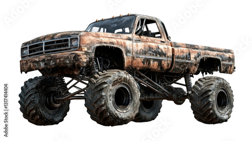 Vintage Muddy Pickup Truck with Oversized Tires in Off-Road Setting