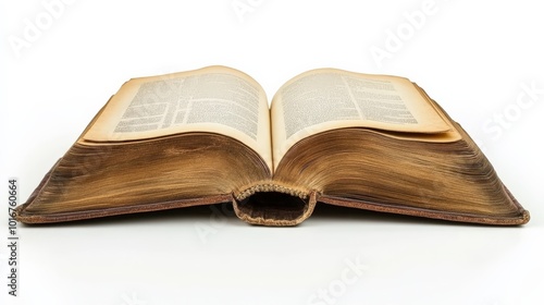 Vintage open book with worn pages on a white background, highlighting texture and history. Perfect for literature or education themes.