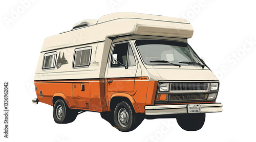 Vintage orange camper van parked in front of scenic mountains on transparent background