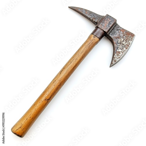 vintage pickaxe with wood handle isolated on white background