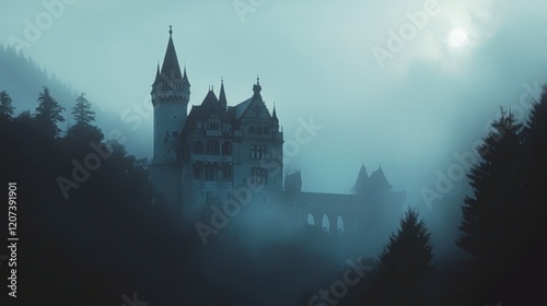Vintage poster of a castle in the mist with gothic elements and classic dark tones.
