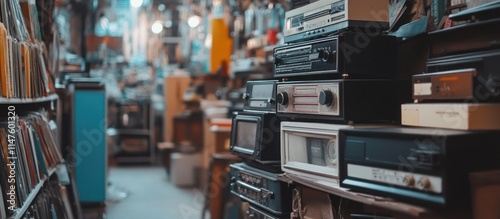 Vintage radios and record players stacked in a secondhand electronics shop,