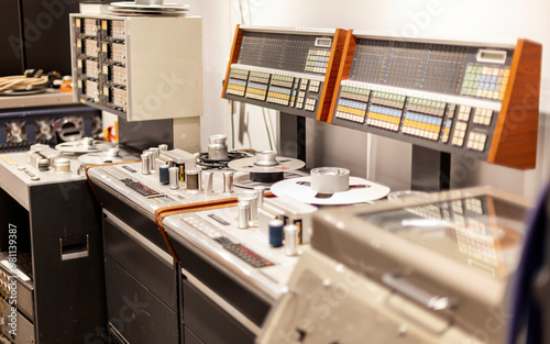 Vintage recording studio equipment with reel-to-reel tape machines and sound mixing panels.