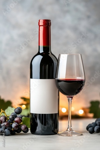 Vintage red wine bottle with a poured glass and fresh grapes creating a cozy atmosphere by the fireplace