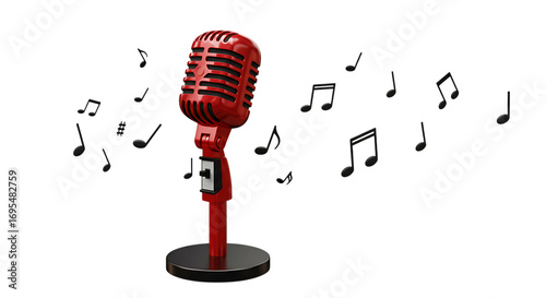 Vintage retro red microphone with a classic design and metallic stand isolated on white background