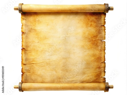 Vintage rolled parchment banner. Grunge white background, antique paper texture. Isolated scroll.