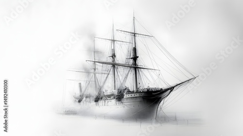 Vintage Sailing Ship with Tall Masts in Foggy Atmosphere at Sea