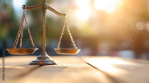 Vintage scale with golden pans resting on a wooden table illuminated by warm sunlight showcasing symbols of balance and justice : Generative AI
