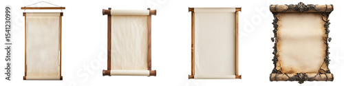 Vintage Scroll Collection: A quartet of old, weathered scrolls, their aged parchment evoking an atmosphere of history, mystery, and the allure of hidden knowledge, presented in various styles.