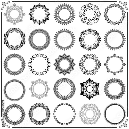 Vintage set of round elements. Different elements for decoration and design frames, cards, menus, backgrounds and monograms. Classic black patterns. Set of vintage patterns