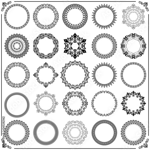 Vintage set of round elements. Different elements for decoration and design frames, cards, menus, backgrounds and monograms. Classic patterns. Set of vintage black and white patterns