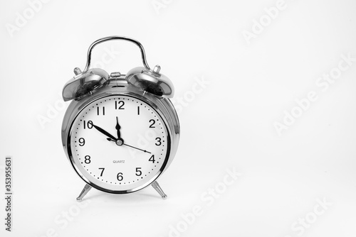 Vintage silver alarm clock is to the left of white background.