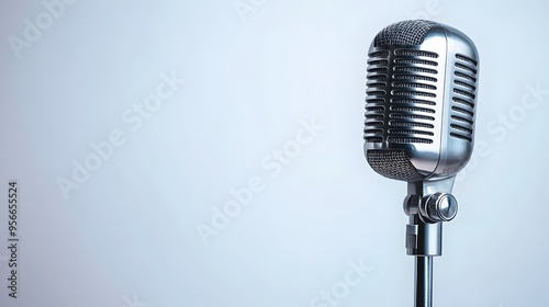 Vintage silver microphone, retro studio mic, pure white background, sound wave visualization, audio waveform, voice recording concept, podcast equipment, broadcasting symbol.