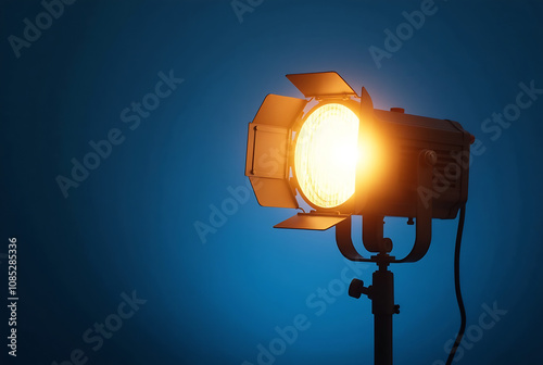 Vintage spotlight on a blue background. It is lit and ready to shine a bright light. A great photo for a film, theater, or studio project.