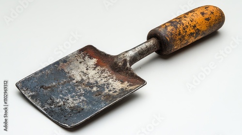 Vintage steel trowel with worn handle placed on a clean background showcasing its weathered texture and aged appearance.