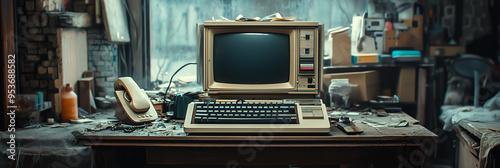 Vintage style room atmosphere with retro technology. both computers and old telephone