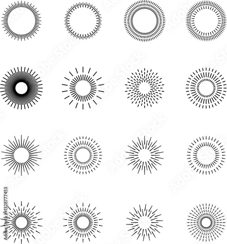Vintage sunburst set. Bursting rays sunrise firework starburst blast, Radiant Spark. Rays. Geometric Design Elements. Retro radiant sunburst, starburst hand drawn label, sun rays.