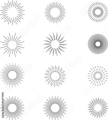 Vintage sunburst set. Bursting rays sunrise firework starburst blast, Radiant Spark. Rays. Geometric Design Elements. Retro radiant sunburst, starburst hand drawn label, sun rays.