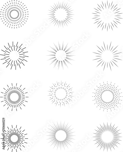 Vintage sunburst set. Bursting rays sunrise firework starburst blast, Radiant Spark. Rays. Geometric Design Elements. Retro radiant sunburst, starburst hand drawn label, sun rays. Vector