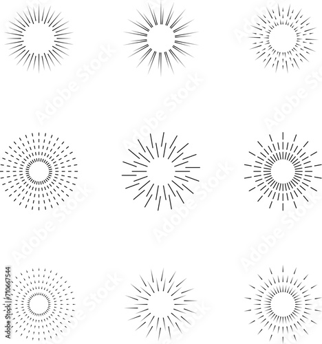 Vintage sunburst set. Bursting rays sunrise firework starburst blast, Radiant Spark. Rays. Geometric Design Elements. Retro radiant sunburst, starburst hand drawn label, sun rays. Vector