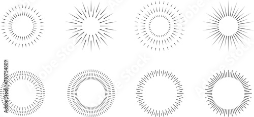 Vintage sunburst set. Bursting rays sunrise firework starburst blast, Radiant Spark. Rays. Geometric Design Elements. Retro radiant sunburst, starburst hand drawn label, sun rays. Vector