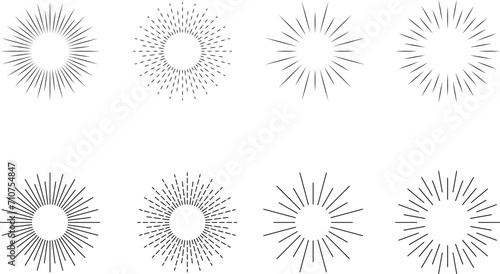 Vintage sunburst set. Bursting rays sunrise firework starburst blast, Radiant Spark. Rays. Geometric Design Elements. Retro radiant sunburst, starburst hand drawn label, sun rays. Vector