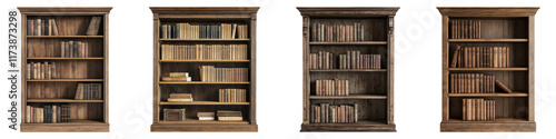 Vintage wood bookcase with book isolated on transparent background, Set of