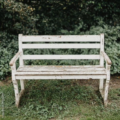 Vintage wooden bench with splintered edges and peeling paint, positioned in an overgrown garden, capturing the essence of countryside serenity