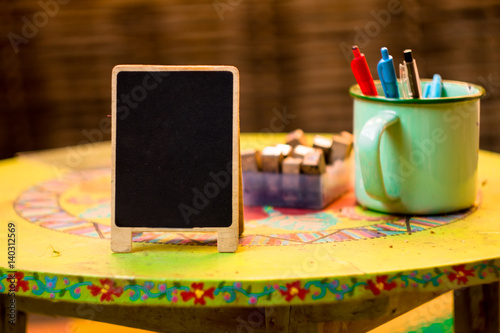 vintage Wooden board sign label on the table. Stand tent card Used for Menu Bar and restaurant or put everything into it . mockup