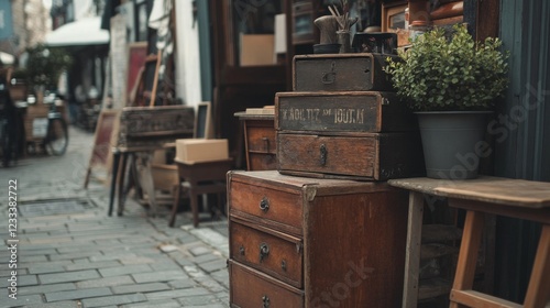 Vintage wooden furniture displayed on a cobblestone street in a quaint market setting