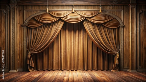 Vintage wooden stage front with elegant draped curtains , vintage, wooden, stage, front, elegant, draped, curtains