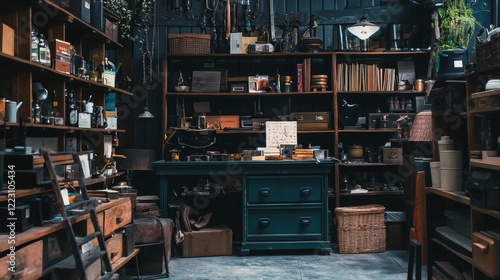 Vintage workshop with wooden shelves filled with tools and artifacts