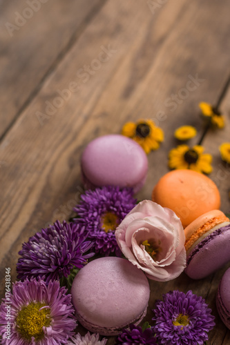 Violet and yellow macarons and flowers on wooden table background. Colorful french dessert with fresh flowers. Autumn concept