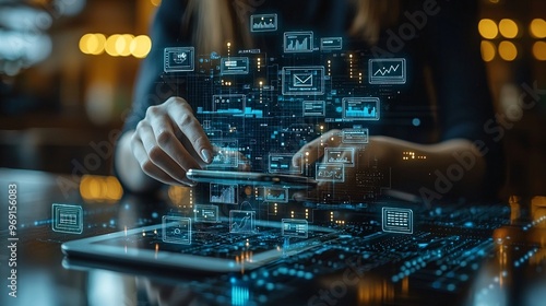 Virtual banking icons and cryptocurrency floating above a smartphone as a person manages futuristic financial transactions.