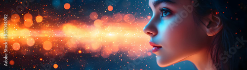 Virtual Communication: Person on Video Call with Abstract Digital Background, Remote Work Concept, Side Profile View with Laptop Screen, Remote Communication Technology - Stock Photo