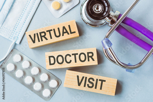 Virtual Doctor Visit Concept Displayed With Wooden Blocks, Stethoscope, and Medication