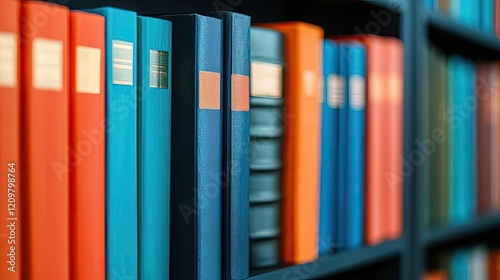 Virtual education concept. A colorful collection of books lined up on a shelf, showcasing various covers and sizes.