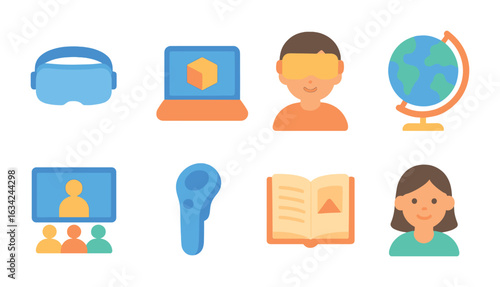 Virtual Learning Icons. Flat vector mini-illustrations virtual reality education in colors children's