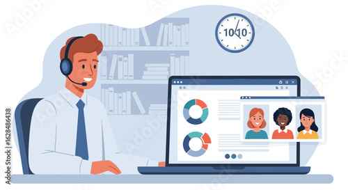 Virtual Meeting With Online Charts And Call Center Agent Man