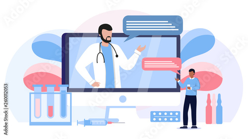 Virtual personal family doctor vector illustration. Flat tiny persons medical app concept. Virtual emergency health consultation. Professional help using biotech artificial intelligence for diagnose
