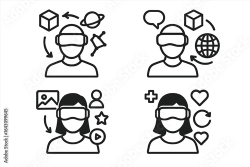 Virtual reality experiences highlighting user interaction in various scenarios with technology in modern settings