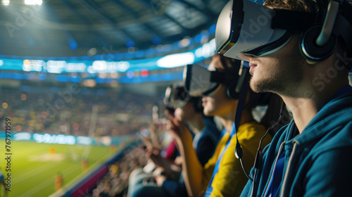 Virtual reality fan zones in a smart stadium, spectators wearing VR headsets for an immersive game view.
