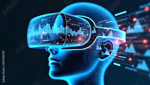 Virtual Reality Interface An abstract design of a virtual reality headset with holographic displays emerging from it, showcasing data and digital landscapes.
