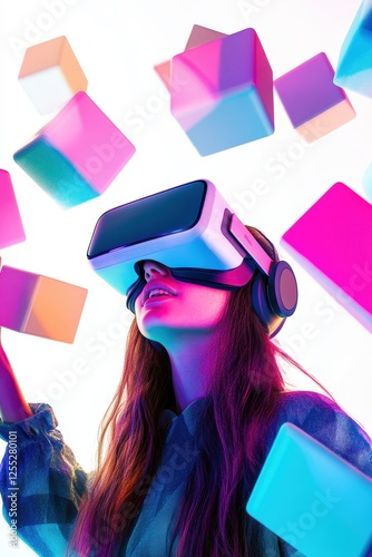 Virtual reality technology engaging user in immersive experience with colorful geometric shapes. Gaming, digital art, and future innovation in entertainment industry.